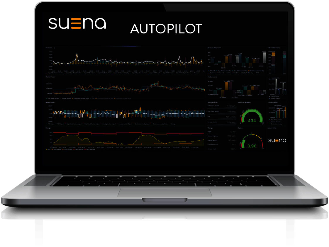 With the suena autopilot, the Hamburg-based company provides a complete digital twin of large-scale battery storage systems. Using AI and machine learning methods, the battery status and battery aging levels are integrated into operational management. The suena autopilot thereby facilitates complex marketing strategies on a wide variety of energy markets. Millions of data points are included to take real-time fluctuations in the power grid, battery aging and other fluctuations into account, for example. Suena GmbH also provides an appealing analysis and trading SaaS.